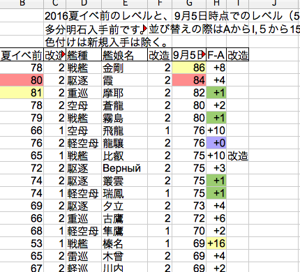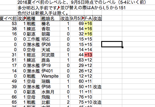 こちらは2016夏イベ直前のレベルと比較して、今回のイベントでどれだけレベルが上がったか?の一部です。